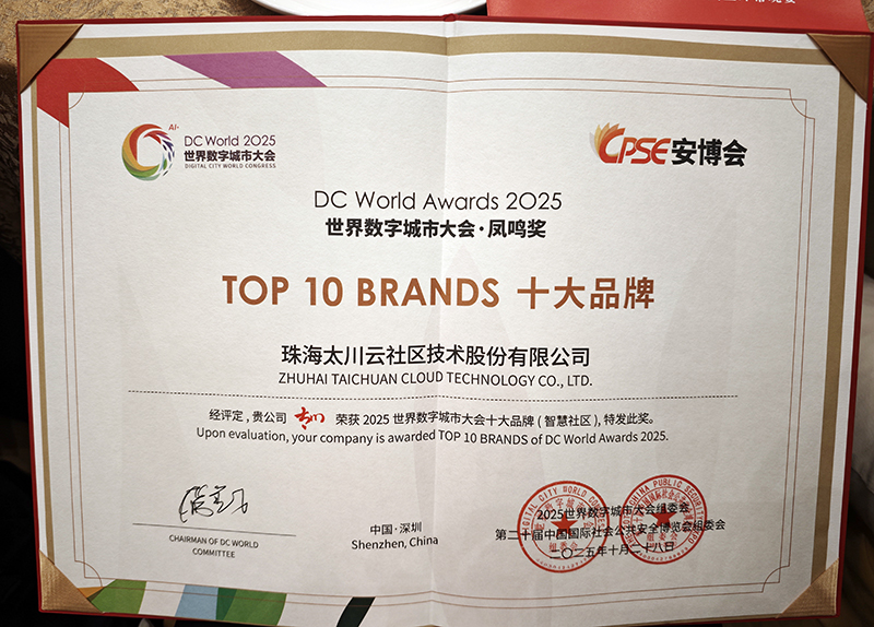 在這場聚焦智慧未來的行業(yè)盛宴中,太川股份憑借二十余年深耕智慧社區(qū)與智能家居領(lǐng)域的技術(shù)積累,以及持續(xù)迭代的創(chuàng)新實(shí)力,榮膺“2025 世界數(shù)字城市大會(huì)十大品牌 (智慧社區(qū))” 獎(jiǎng)項(xiàng)。
