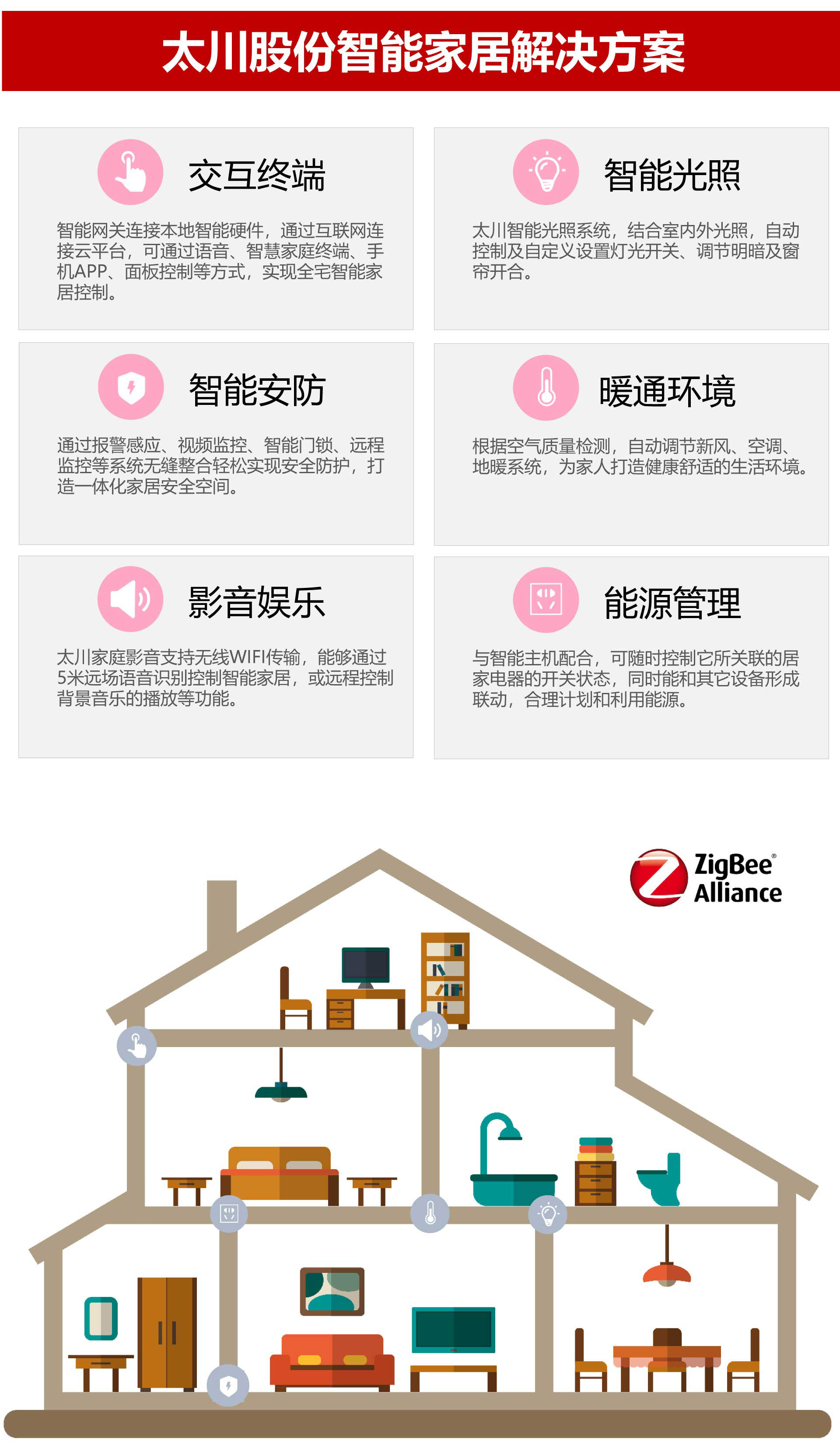 太川股份智能家居解決方案可打造全宅智能控制,實(shí)現(xiàn)交互終端、智能光照、智能安防、暖通環(huán)境、影音娛樂(lè)、能源管理六大智能系統(tǒng)的各種設(shè)備智能互聯(lián),打造科技舒適、平安家居、健康環(huán)保的全宅智慧新生活。