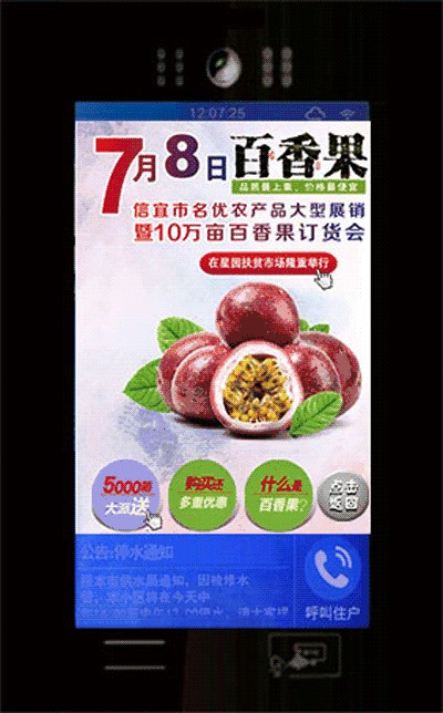 原來,作為本次活動的唯一戶外推廣渠道,珠海農(nóng)副產(chǎn)品市場協(xié)會與某傳媒公司攜手帶來了專屬市民活動的福利,為廣大市民開通了方便快捷的購買方式和渠道,只需要通過的小區(qū)的10寸門禁互動廣告屏幕,即可輕松查詢或了解優(yōu)惠信息,實(shí)現(xiàn)了線下宣傳和線上傳播的完美融合,直接促成了扶貧日當(dāng)天百香果訂貨會的人潮洶涌,碩果累累。