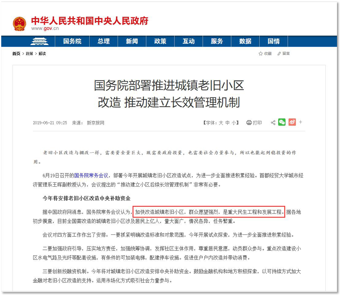 6月19日,國(guó)務(wù)院常務(wù)會(huì)議提出“加快推進(jìn)城鎮(zhèn)老舊小區(qū)改造”。文件指出:老舊小區(qū)改造涉及居民上億人,能夠促進(jìn)住戶戶內(nèi)改造并帶動(dòng)消費(fèi)。
