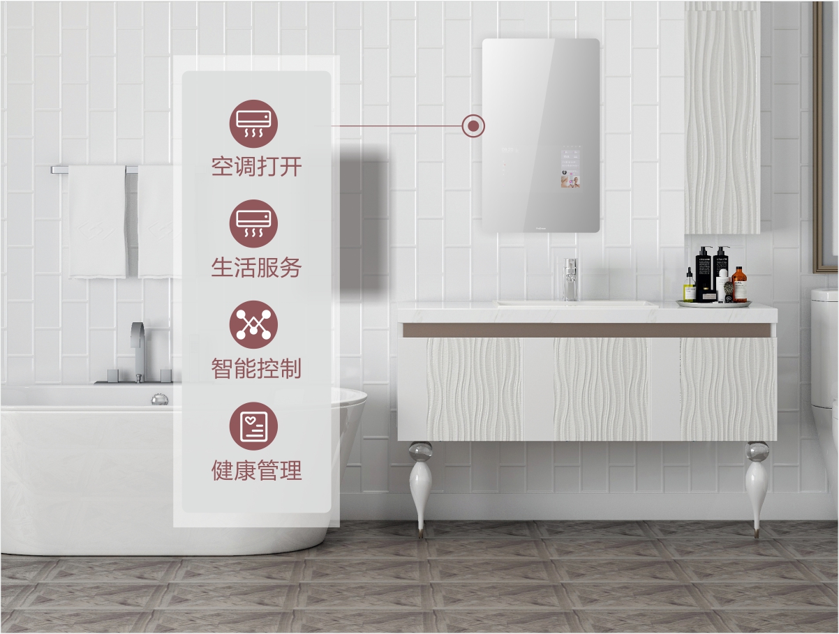 浴室安裝的智能魔鏡與睡眠儀、血壓測量儀等健康設(shè)備連接,可完成基礎(chǔ)的健康體檢。同時可與室內(nèi)的智能設(shè)備實現(xiàn)互聯(lián),通過鏡面的觸控面板,集中控制燈光、窗簾、空調(diào)、音樂等,實現(xiàn)全屋聯(lián)動控制。