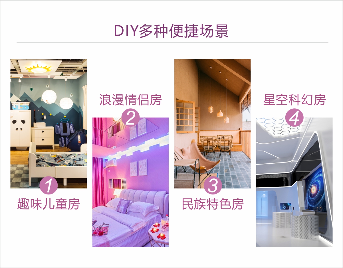 不僅如此,還能根據(jù)不同需求DIY個性化主題客房,例如利用燈光與室內(nèi)的軟裝搭配,營造夢幻有趣的兒童房、溫馨浪漫的情侶房、民族韻味的特色房、星空閃爍的科幻房……智能化控制,一鍵營造舒適便捷的個性化智能場景。
