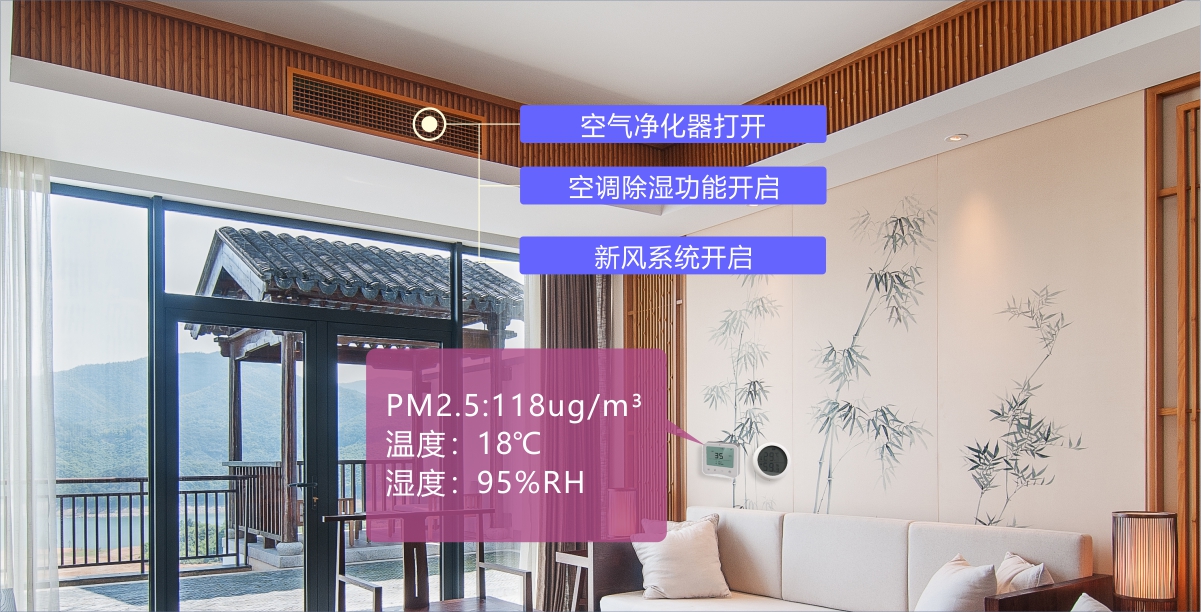 客房內(nèi),空氣檢測儀、無線溫濕度傳感器等智能設(shè)備實時感知客房中PM2.5、甲醛、溫濕度等變化。當客房中環(huán)境偏離舒適區(qū)間時,立即聯(lián)動開啟新風(fēng)系統(tǒng)、空氣凈化器或空調(diào)等改善屋內(nèi)環(huán)境,時刻保持健康舒適的居住環(huán)境。