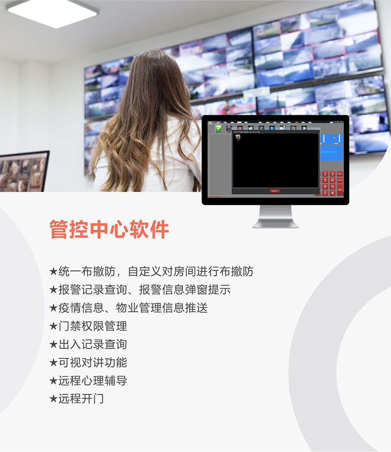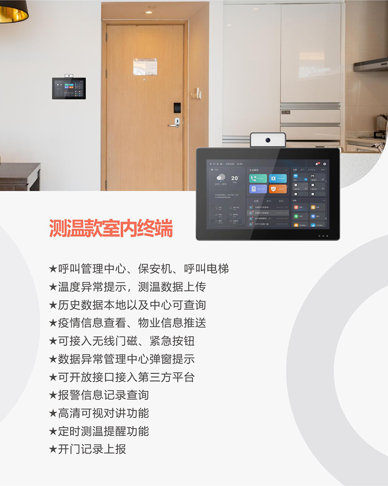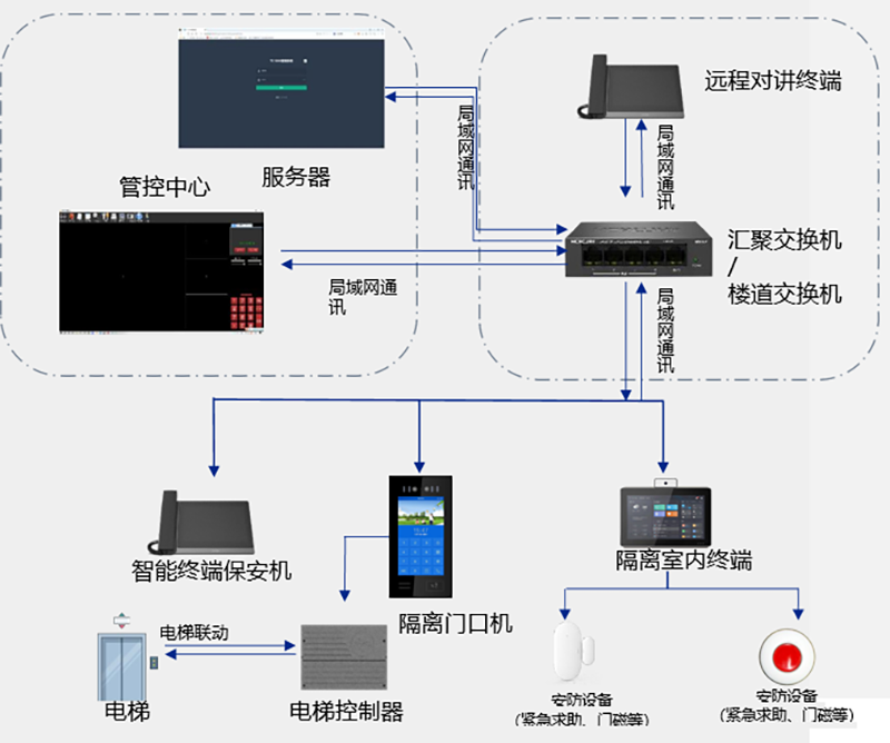 通過(guò)室內(nèi)終端設(shè)備可以實(shí)現(xiàn)與政府的指揮中心、隔離區(qū)的醫(yī)院、護(hù)士站、樓棟管理人員進(jìn)行視頻通話,便于醫(yī)護(hù)人員對(duì)隔離病人情況的管理,同時(shí)隔離人員可以通過(guò)室內(nèi)終端和隔離病房區(qū)的管理中心進(jìn)行遠(yuǎn)程溝通,便于管理人員對(duì)疫情隔離人員的生活物資等信息進(jìn)行統(tǒng)一管理。