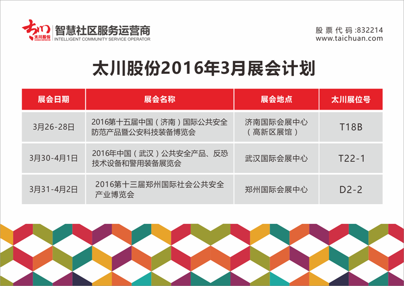 2016年3月,太川將出席山東濟南、湖北武漢、河南鄭州三地的安防盛會。