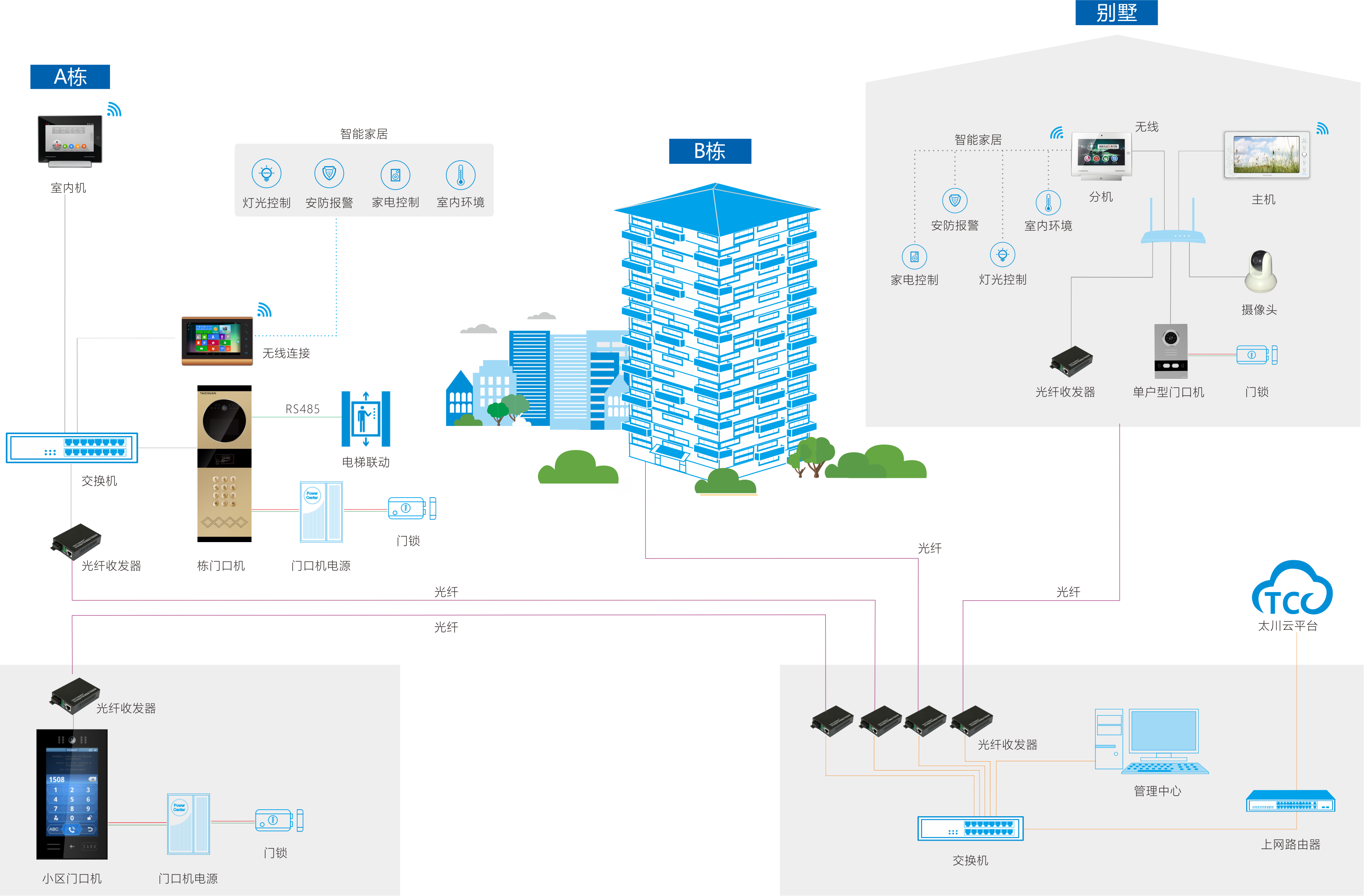 太川股份樓宇對講系統(tǒng)除了傳統(tǒng)的對講開鎖功能外,還與智能家居相結合。匯集了手機APP遠程控制、無線安防報警、室內(nèi)監(jiān)控查看、電梯聯(lián)動、社區(qū)信息推送等眾多便捷化功能;在社區(qū)信息化、改善居住品質、提高物業(yè)服務質量等方面中都發(fā)揮著巨大的作用。