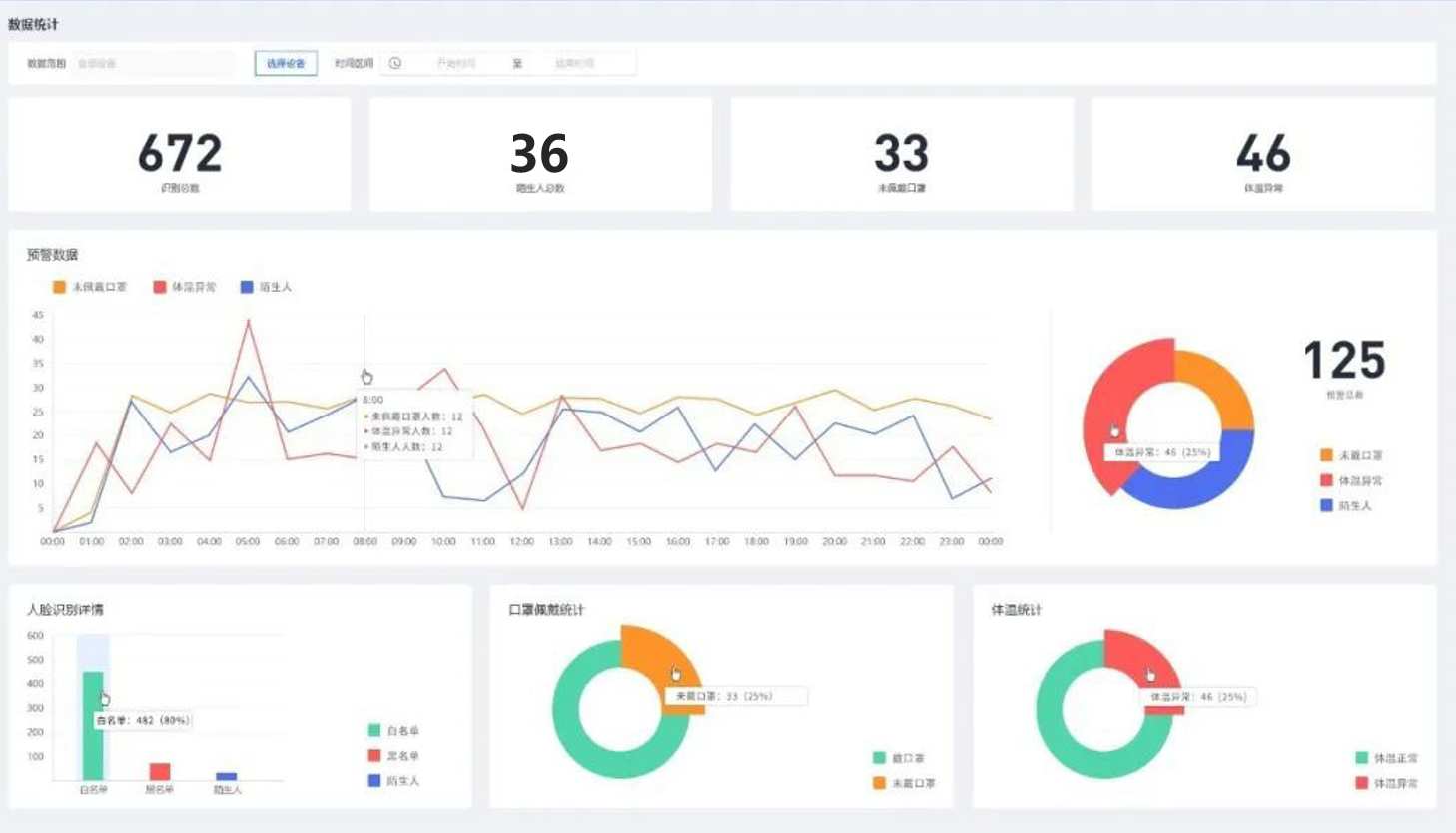 內(nèi)置人臉識(shí)別、口罩算法,檢測(cè)人臉和口罩佩戴情況,識(shí)別人臉后與人臉庫對(duì)比,學(xué)生及教職工人員正??焖龠M(jìn)出校園,攔截未戴口罩人員、陌生人、危險(xiǎn)人員及體溫異常人員,同時(shí)報(bào)警提醒,保證校內(nèi)人員安全。