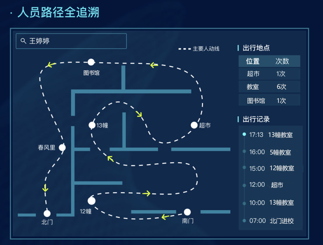 可隨時(shí)查看學(xué)校所有師生疫情上報(bào)記錄,列表信息包含師生個(gè)人基礎(chǔ)信息、測(cè)量溫度、健康狀態(tài)、是否發(fā)熱及是否接觸疫情人員等信息,并針對(duì)特定人員篩查高效建立出入軌跡模型,提高事前預(yù)警、事中處理,事后追溯的工作效率。