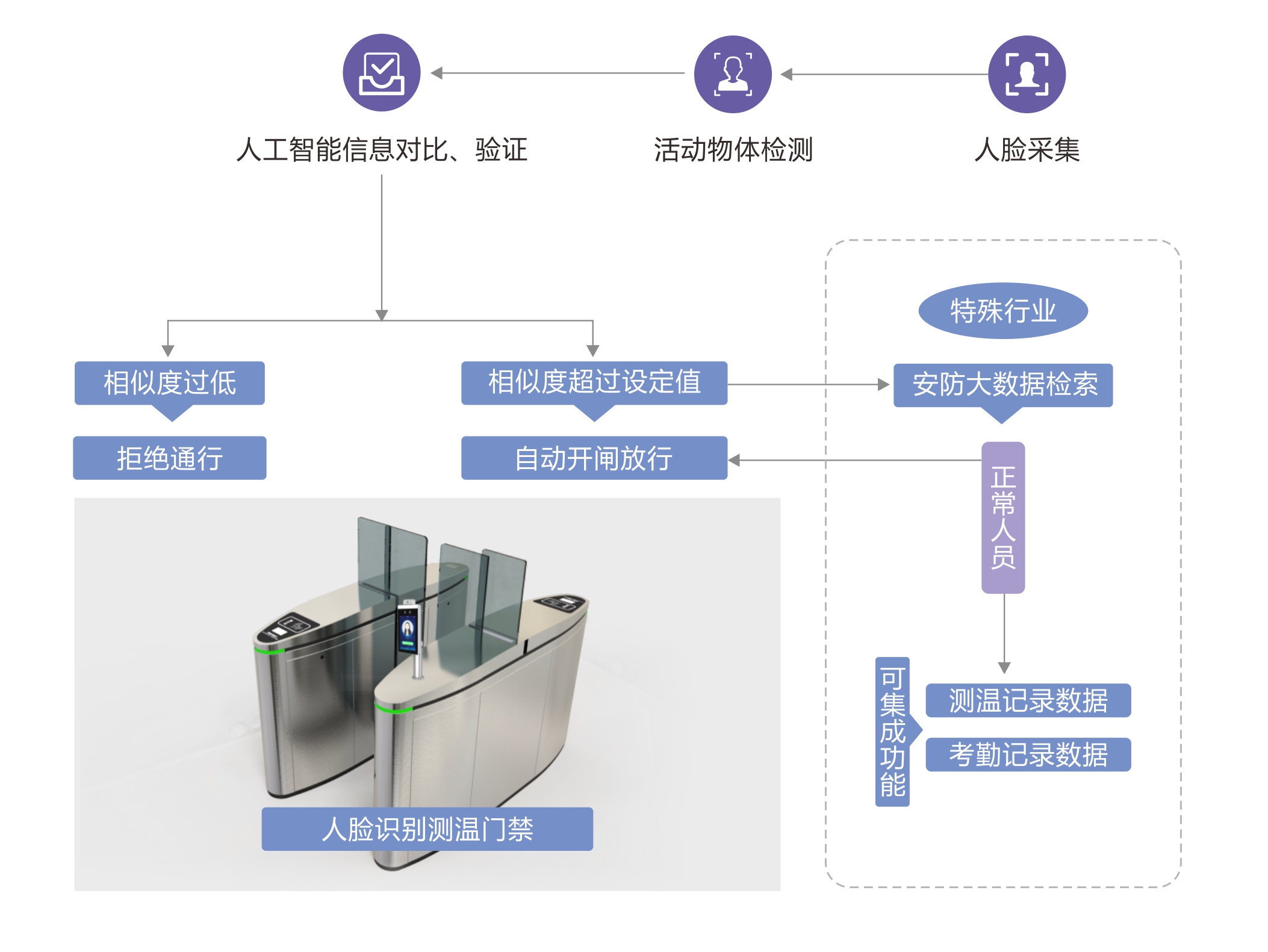 因此,各大企業(yè)紛紛出臺(tái)政策應(yīng)對(duì),太川股份也亮出大招推出智能測(cè)溫門禁系統(tǒng),通過在校園主要場(chǎng)所部署,可實(shí)現(xiàn)“無接觸無感測(cè)溫”,具備人臉識(shí)別、紅外測(cè)溫、戴口罩檢測(cè)等功能,可對(duì)人員身份、體溫及是否戴口罩進(jìn)行精準(zhǔn)識(shí)別及檢測(cè),為師生開學(xué)復(fù)課提供安全保障。