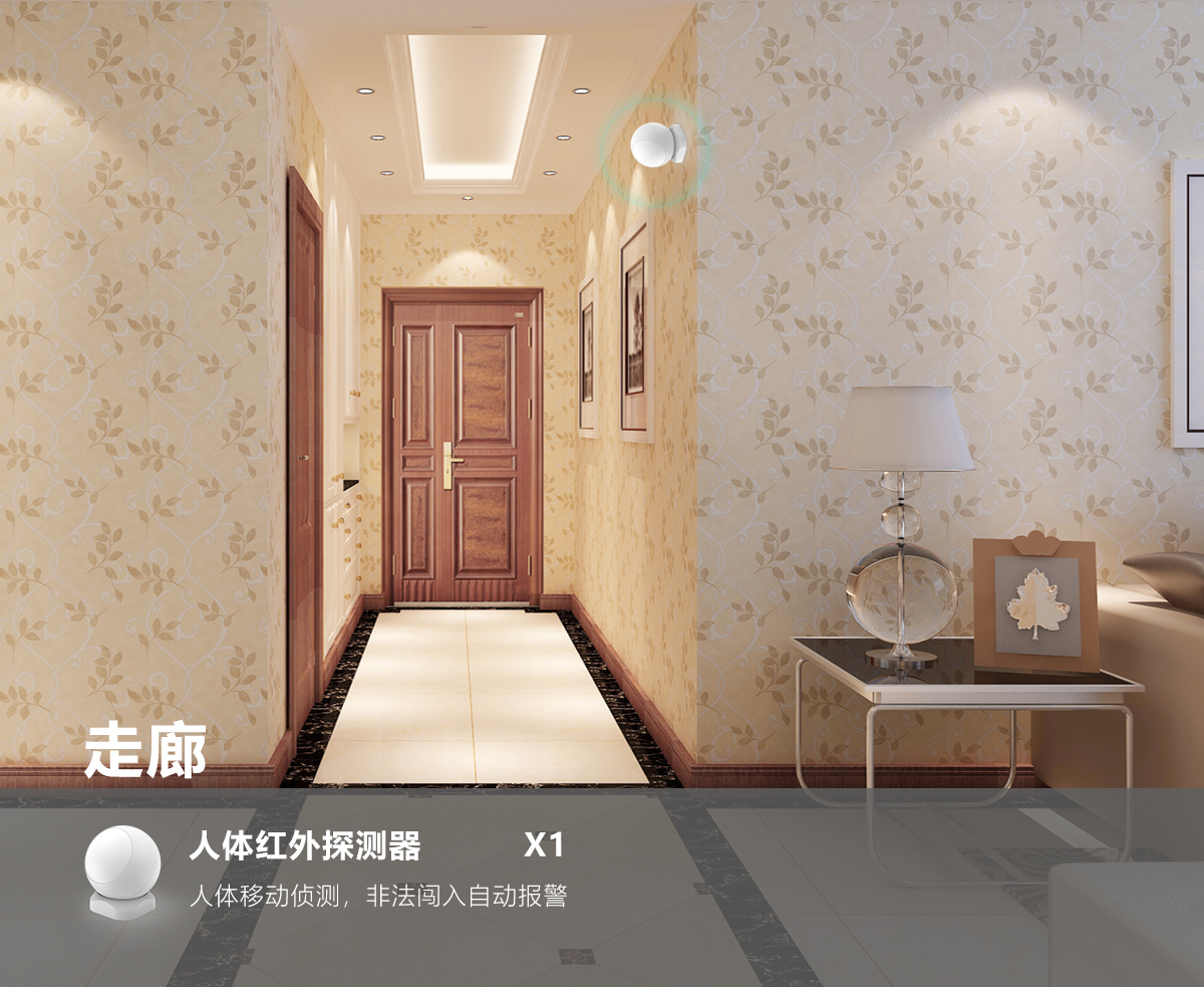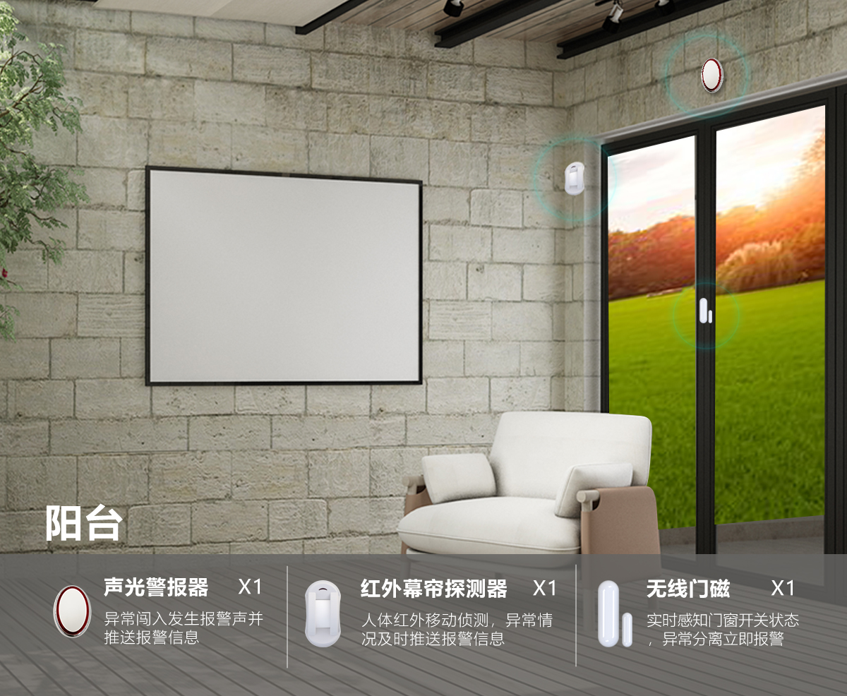 陽臺:聲光報警器+紅外幕簾探測器+無線門磁