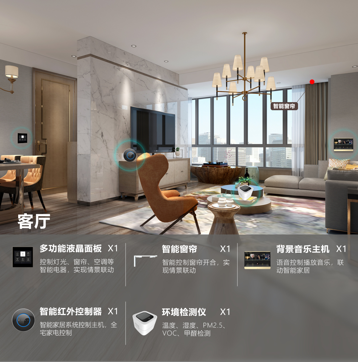 客廳:多功能液晶面板+背景音樂+環(huán)境檢測儀+智能紅外控制器+智能窗簾