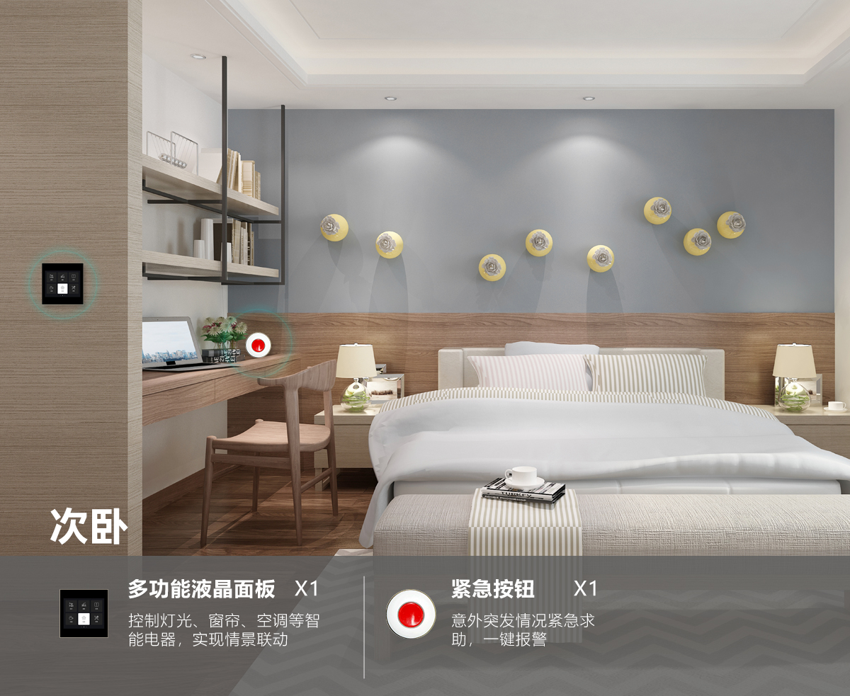 通過多功能液晶面板設置我們的燈光模式,夜晚入睡時可通過手機APP一鍵開啟睡眠模式,空調調到舒適溫度,窗簾閉合,讓你每晚都擁有甜甜的美夢!如果老人居住也可以安裝一個緊急按鈕,突發(fā)情況下可以及時向家人求救。