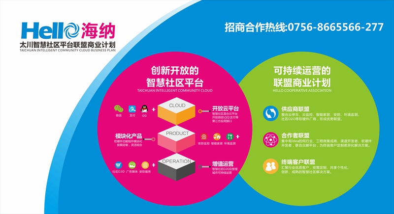 太川的“HELLO海納”聯(lián)盟商業(yè)計劃,旨在整合云停車、云監(jiān)控、智能家居、安防、環(huán)境監(jiān)測、社區(qū)O2O等領(lǐng)域的軟硬件廠商,形成供應(yīng)商聯(lián)盟,技術(shù)互通,資源共享,減少重復(fù)開發(fā)成本,提高創(chuàng)新研發(fā)效率,促進(jìn)供應(yīng)商軟硬件平臺完美對接。
