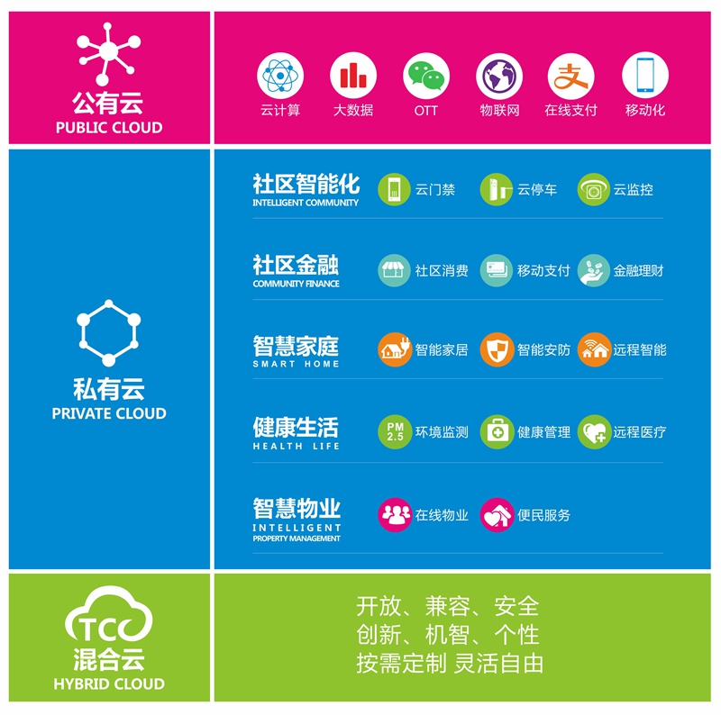 創(chuàng)新融合、高性能低成本、靈活擴(kuò)展的太川TCC智慧社區(qū)云,可助力傳統(tǒng)硬件廠商、中小平臺服務(wù)商、地產(chǎn)及物業(yè)運(yùn)營商快速搭建穩(wěn)定可靠、安全可控的智慧社區(qū)云平臺,順利實(shí)現(xiàn)產(chǎn)業(yè)轉(zhuǎn)型、升級。同時,TCC混合云平臺,可開放微信、支付等第三方接口,實(shí)現(xiàn)靈活擴(kuò)展。