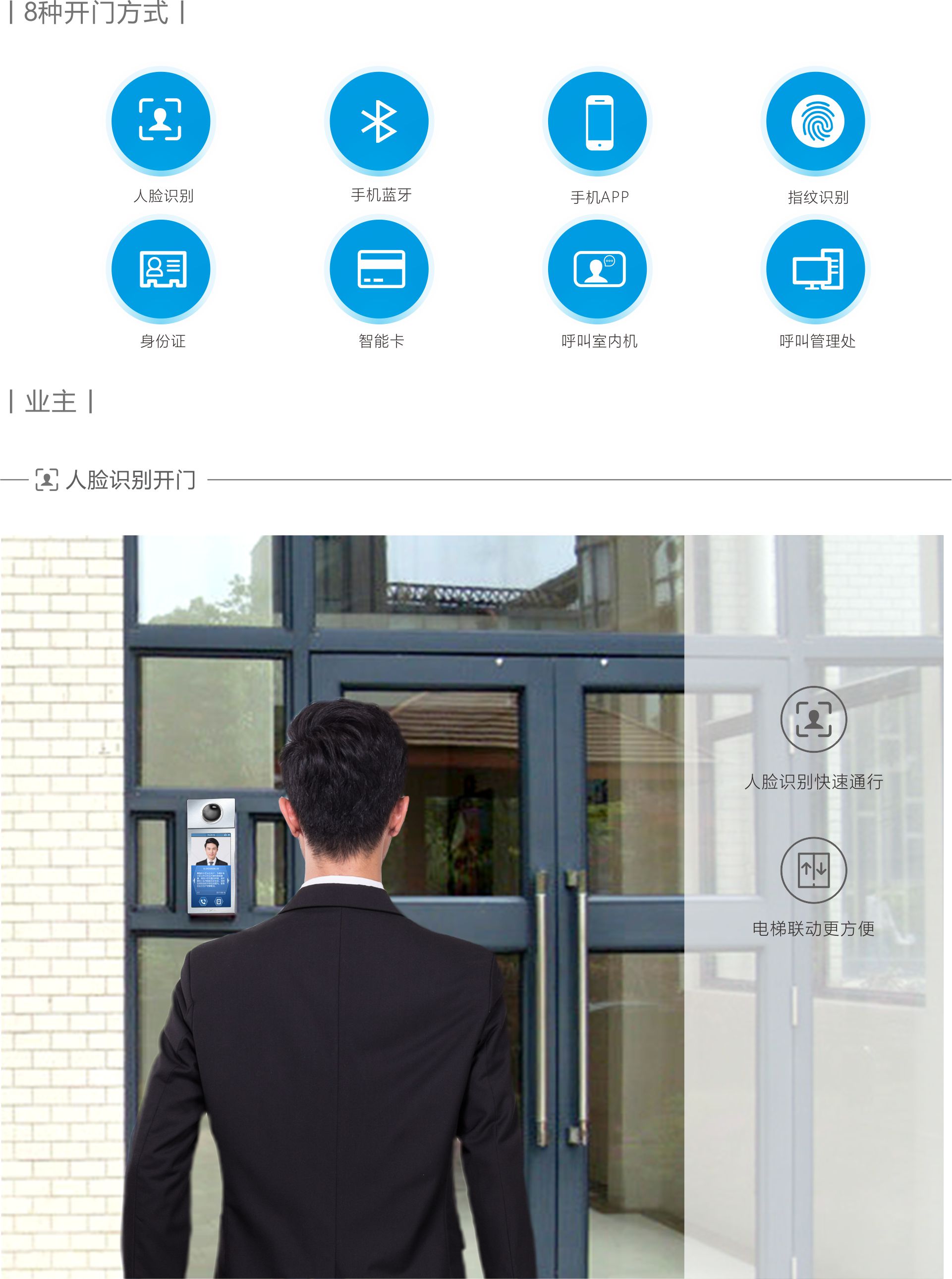 可根據(jù)需要部署人臉識(shí)別/手機(jī)APP遠(yuǎn)程開(kāi)鎖等多種開(kāi)門(mén)方式,以及電梯聯(lián)動(dòng)功能,客戶(hù)體驗(yàn)一流。