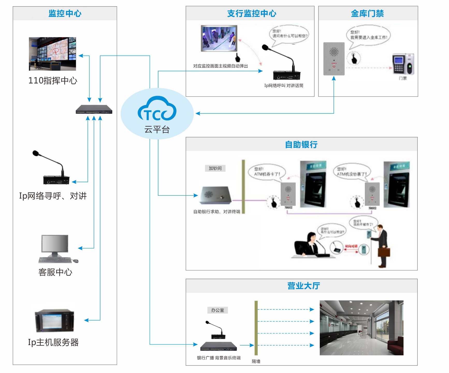 太川股份為促進(jìn)關(guān)于銀行“三防一?!惫ぷ髀鋵?shí),實(shí)現(xiàn)現(xiàn)代化、高效管理的具體要求,結(jié)合現(xiàn)今行業(yè)發(fā)展水平,利用先進(jìn)技術(shù),采用安全可靠的設(shè)計(jì)方案,建立一套高性能的”智慧金融報(bào)警服務(wù)系統(tǒng)”,實(shí)現(xiàn)分行和總行管理中心和每個(gè)前端網(wǎng)點(diǎn)進(jìn)行無縫溝通,為顧客提供業(yè)務(wù)指導(dǎo)、緊急情況求助、報(bào)警呼叫、語(yǔ)音安防廣播等功能。